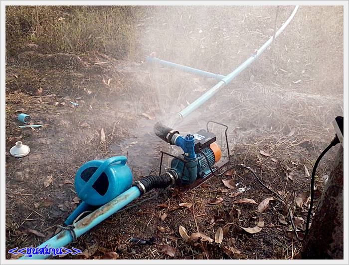 เจอปัญหาเข้าให้แล้วครับ เดิมทีผมใช้วิธีสูบน้ำใส่ร่องข้างแปลงชะอม แล้วใช้ที่ตักรดน้ำเอา ปั๊มน้ำก็ยกเข้า ยกออก จะใช้งานทีก็ยกมาติดตั้งกับท่อดูด แล้วสูบใส่แปลง เสร็จก็ยกไปเก็บในห้อง เพราะกลัวโดนขโมยปั๊มน้ำ เลยใช้ข้ออ่อน ซึ่งเป็นท่ออากาศของรถยนต์มาต่อ เป็นท่อที่ให้ตัวได้ จะคดซ้าย คดขวาไม่ใช่ปัญหา และอีกอย่างเวลาที่ถอดประกอบกับปั๊มน้ำจะง่าย แค่ขันปลอกรัดท่อก็ยกปั๊มน้ำไปเก็บได้แล้ว แต่คงด้วยที่ผมไม่ได้ใช้งานมานานในช่วงหน้าฝน พอเอามาสูบเข้ากับระบบท่อมันเลยมีอาการแบบนี้ แทบจะระเบิด เพราะแต่เดิมผมสูบใส่ร่อง มันไม่มีแรงดันกลับ แต่พอสูบเข้าท่อ มันมีแรงดันภายในท่อ พอไม่มีที่ออก หรือไหลออกทางสปริงเกอร์ไม่ทัน มันก็ดันท่อจนปริ และออกมาตามรูพรุน กลายเป็นน้ำพุไปเลย เป็นเฉพาะท่อทางออกนะครับ ท่อดูดไม่เป็น จะโดนไฟดูดหรือเปล่าเนี่ย